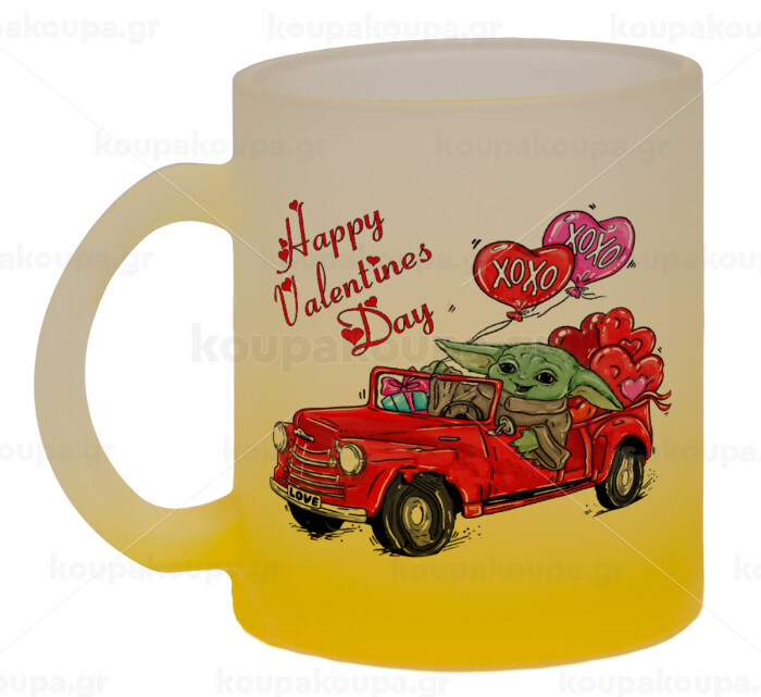 Yoda, happy valentines day (xoxo), Κούπα γυάλινη δίχρωμη με βάση το κίτρινο ματ, 330ml