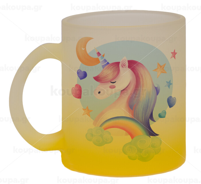 Pink unicorn, Κούπα γυάλινη δίχρωμη με βάση το κίτρινο ματ, 330ml