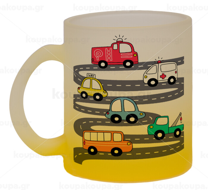 Hand drawn childish set with cars, Κούπα γυάλινη δίχρωμη με βάση το κίτρινο ματ, 330ml