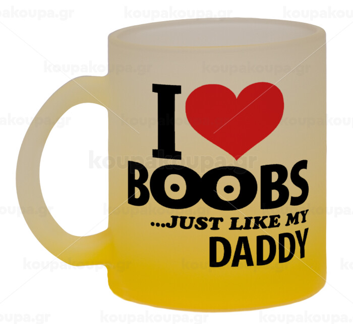 I Love boobs ...just like my daddy, Κούπα γυάλινη δίχρωμη με βάση το κίτρινο ματ, 330ml