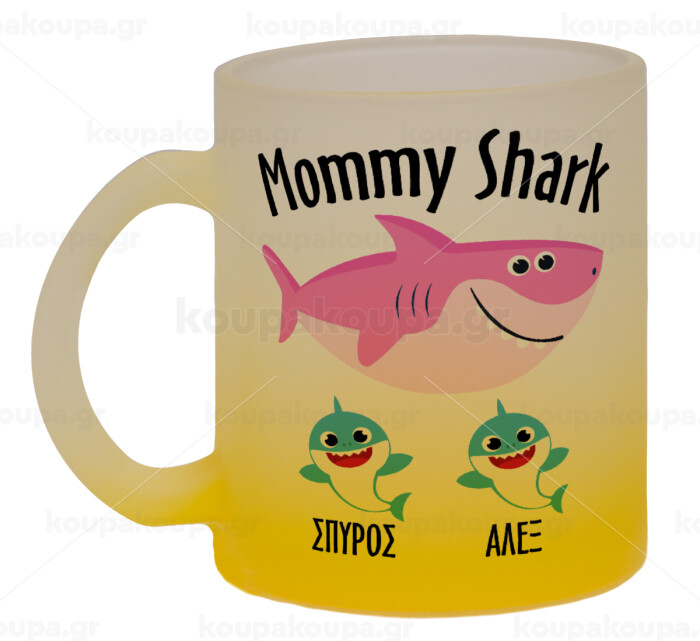 Mommy Shark (με ονόματα παιδικά), Κούπα γυάλινη δίχρωμη με βάση το κίτρινο ματ, 330ml