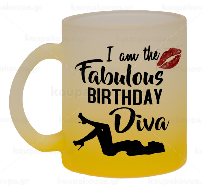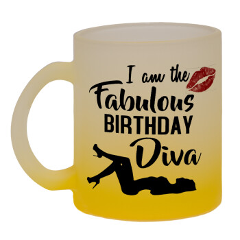 I am the fabulous Birthday Diva, Κούπα γυάλινη δίχρωμη με βάση το κίτρινο ματ, 330ml