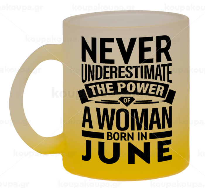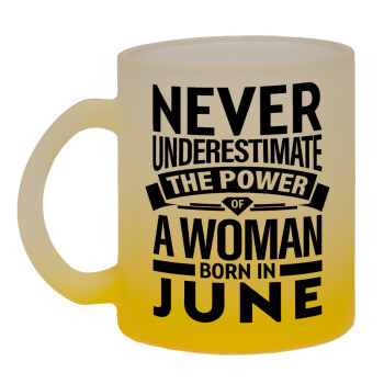 Never Underestimate the poer of a Woman born in..., Κούπα γυάλινη δίχρωμη με βάση το κίτρινο ματ, 330ml