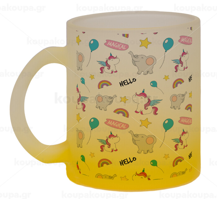Happy Clouds Doodle, Κούπα γυάλινη δίχρωμη με βάση το κίτρινο ματ, 330ml