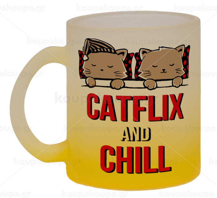Catflix and Chill, Κούπα γυάλινη δίχρωμη με βάση το κίτρινο ματ, 330ml