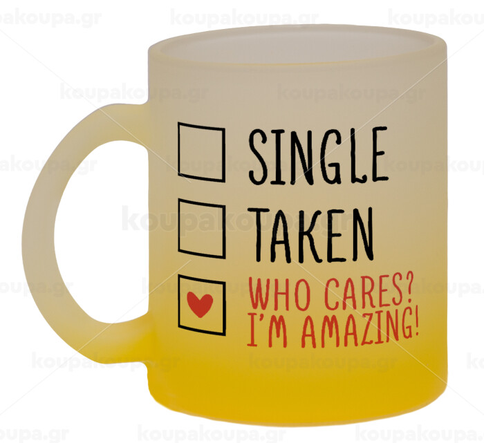 Single, Taken, Who cares i'm amazing, Κούπα γυάλινη δίχρωμη με βάση το κίτρινο ματ, 330ml