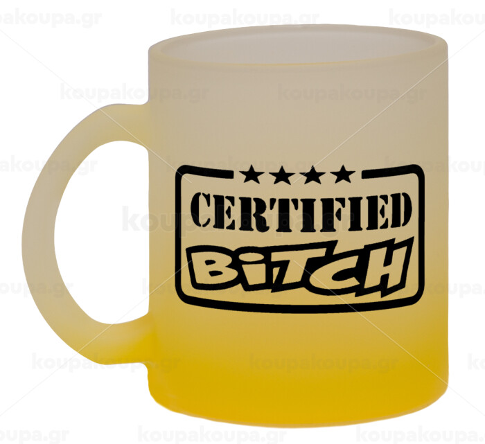Certified Bitch, Κούπα γυάλινη δίχρωμη με βάση το κίτρινο ματ, 330ml