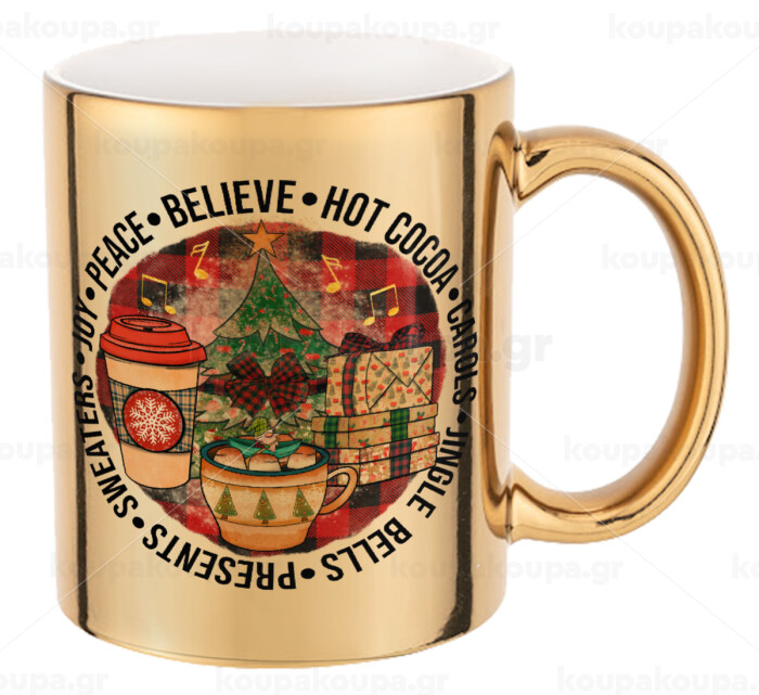 Joy, Peace, Believe, Hot Cocoa, Carols, Mug ceramic, gold mirror, 330ml