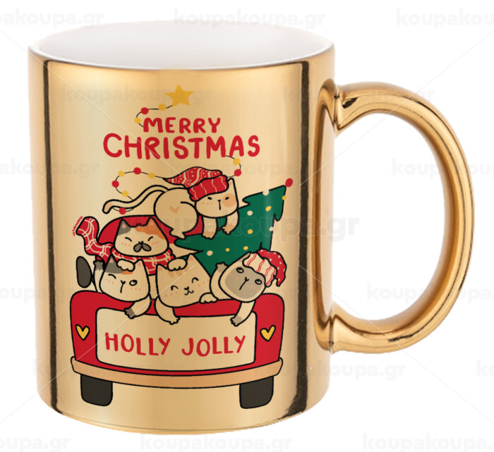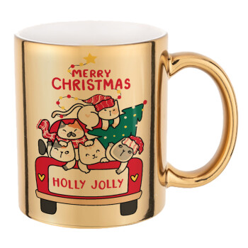 Merry Christmas cats in car, Mug ceramic, gold mirror, 330ml