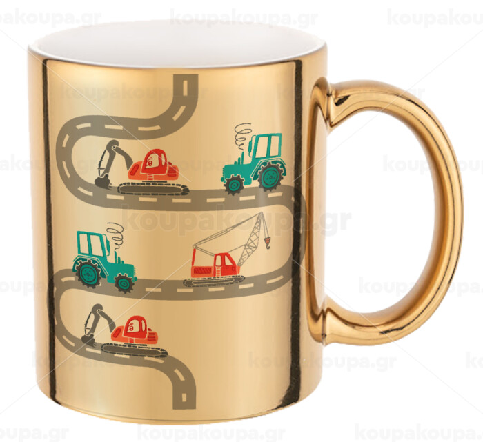 excavator along road, Mug ceramic, gold mirror, 330ml