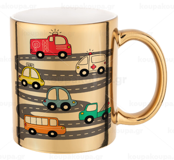 Hand drawn childish set with cars, Mug ceramic, gold mirror, 330ml
