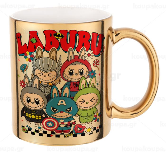 Labubu superheroes, Mug ceramic, gold mirror, 330ml