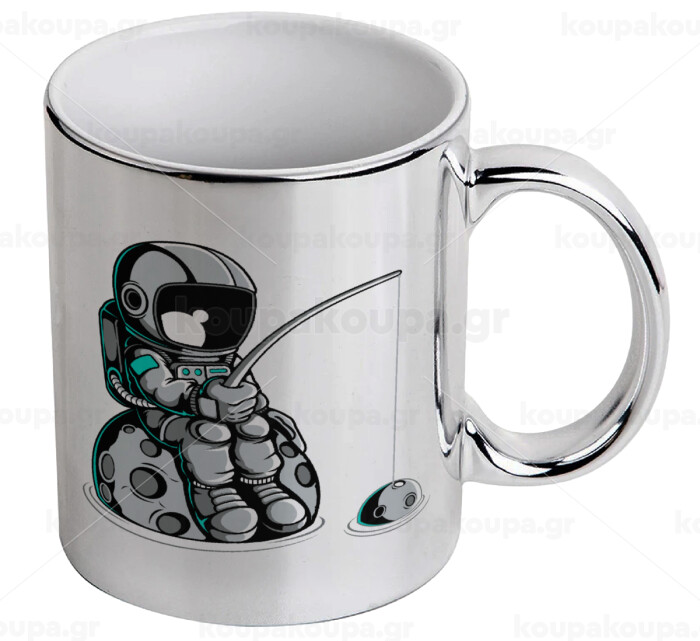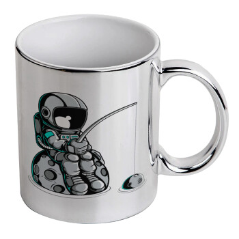 Little astronaut fishing, Mug ceramic, silver mirror, 330ml