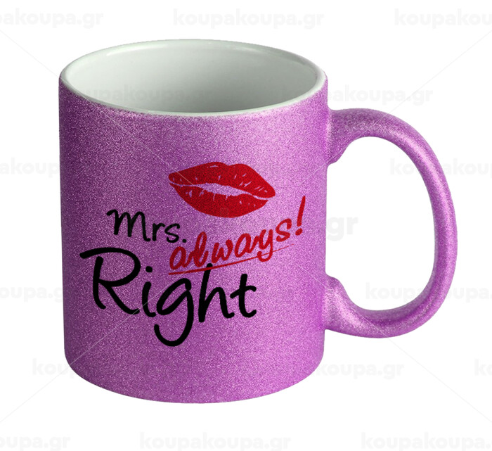 Mrs always right kiss, Κούπα Μωβ Glitter που γυαλίζει, κεραμική, 330ml