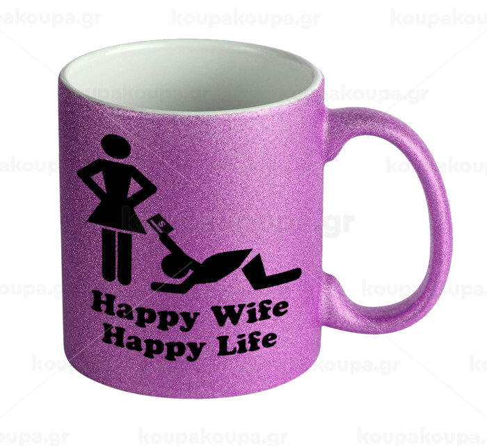 Happy Wife, Happy Life, Κούπα Μωβ Glitter που γυαλίζει, κεραμική, 330ml