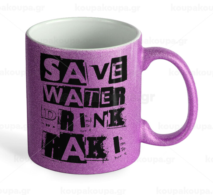 Save Water, Drink RAKI, Κούπα Μωβ Glitter που γυαλίζει, κεραμική, 330ml