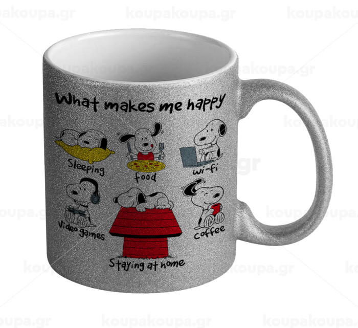 Snoopy what makes my happy, Κούπα Ασημένια Glitter που γυαλίζει, κεραμική, 330ml