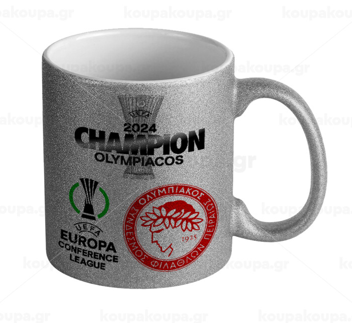 Olympiacos UEFA Europa Conference League Champion 2024, Κούπα Ασημένια Glitter που γυαλίζει, κεραμική, 330ml