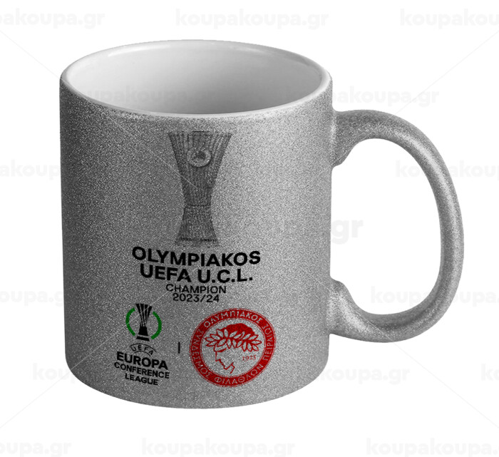 Olympiacos UEFA Europa Conference League Champion 2023/24, Κούπα Ασημένια Glitter που γυαλίζει, κεραμική, 330ml
