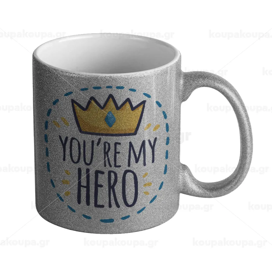 Dad, you are my hero!, Κούπα Ασημένια Glitter που γυαλίζει, κεραμική, 330ml