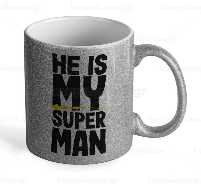 He is my superman, Κούπα Ασημένια Glitter που γυαλίζει, κεραμική, 330ml