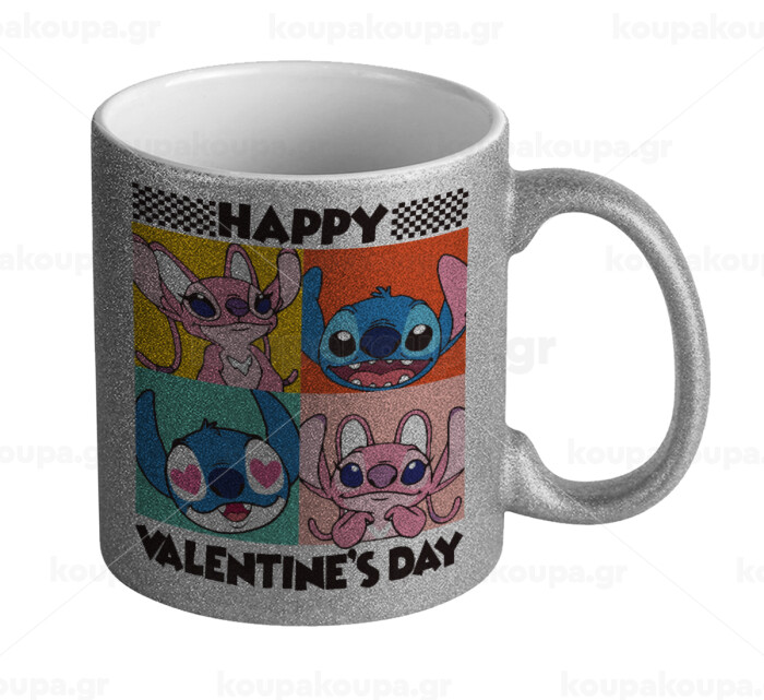 Lilo & Stitch Happy valentines day, Κούπα Ασημένια Glitter που γυαλίζει, κεραμική, 330ml