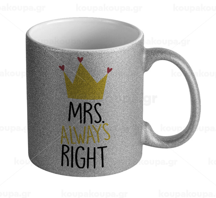 Mrs "Always" right, Κούπα Ασημένια Glitter που γυαλίζει, κεραμική, 330ml
