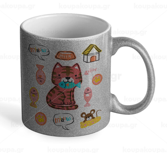 Cats and Fishes, Κούπα Ασημένια Glitter που γυαλίζει, κεραμική, 330ml