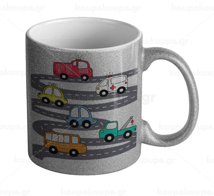 Hand drawn childish set with cars, Κούπα Ασημένια Glitter που γυαλίζει, κεραμική, 330ml