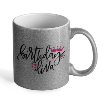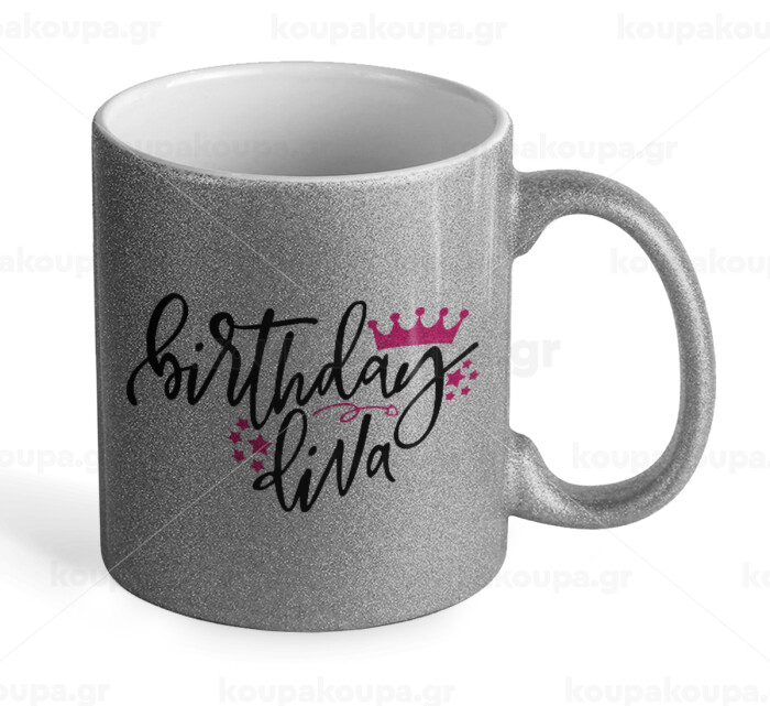 Birthday Diva queen, Κούπα Ασημένια Glitter που γυαλίζει, κεραμική, 330ml