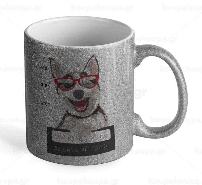 Warning, beware of Dog, Κούπα Ασημένια Glitter που γυαλίζει, κεραμική, 330ml