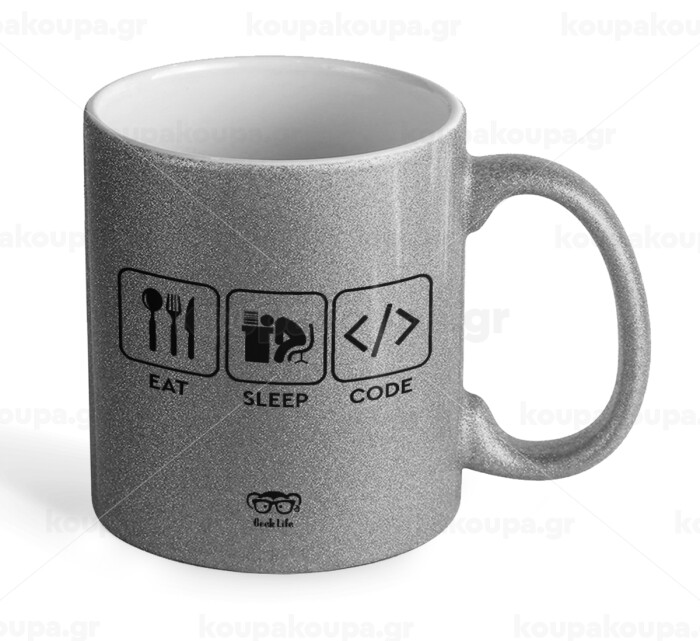 Eat Sleep Code, Κούπα Ασημένια Glitter που γυαλίζει, κεραμική, 330ml
