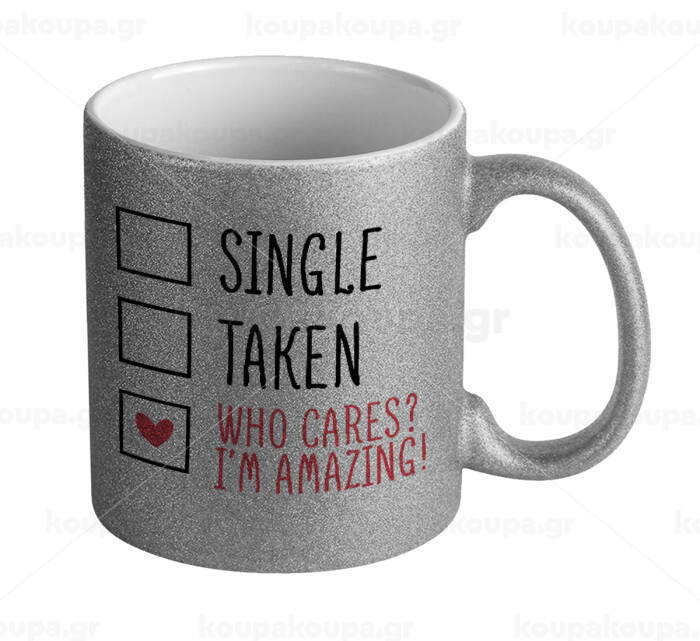 Single, Taken, Who cares i'm amazing, Κούπα Ασημένια Glitter που γυαλίζει, κεραμική, 330ml