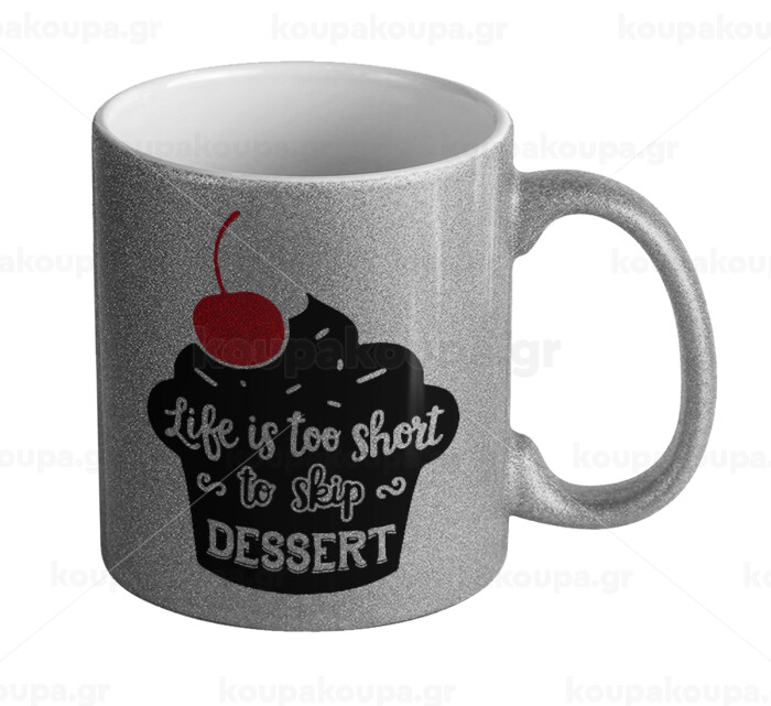Life is too short, to skip Dessert, Κούπα Ασημένια Glitter που γυαλίζει, κεραμική, 330ml