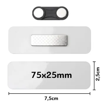 Διάσταση: 75x25mmΧρώμα: ΛΕΥΚΟΥλικό:plexiglassΣύνδεσμος: Διπλός μαγνήτης ρούχουΕκτύπωση: Ελεύθερη χωρίς κανένα περιορισμό σε ολόκληρη την επιφάνεια