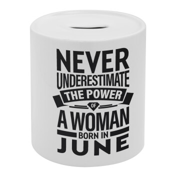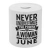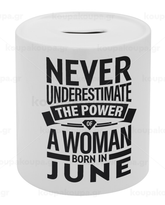 Never Underestimate the poer of a Woman born in..., Κουμπαράς πορσελάνης με τάπα