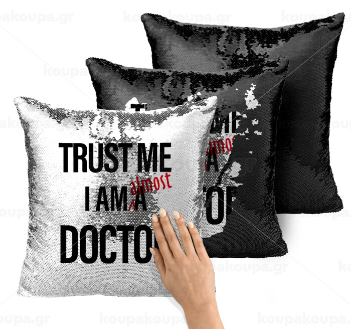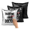 Trust me, i am (almost) Doctor, Μαξιλάρι καναπέ Μαγικό Μαύρο με πούλιες 40x40cm περιέχεται το γέμισμα