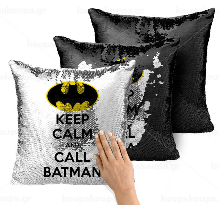 KEEP CALM & Call BATMAN, Μαξιλάρι καναπέ Μαγικό Μαύρο με πούλιες 40x40cm περιέχεται το γέμισμα