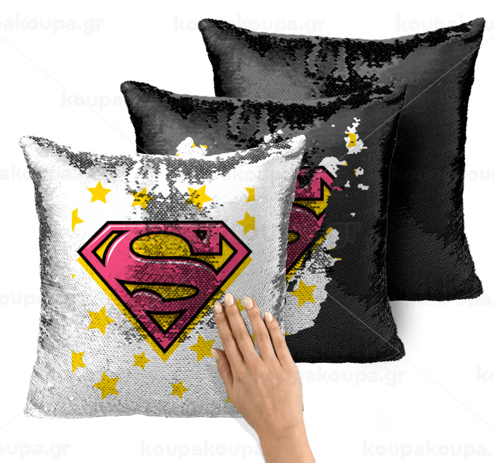 Superman Pink, Μαξιλάρι καναπέ Μαγικό Μαύρο με πούλιες 40x40cm περιέχεται το γέμισμα
