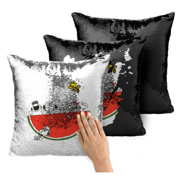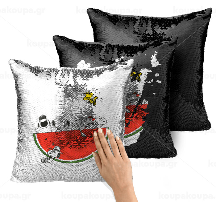 Snoopy summer, Μαξιλάρι καναπέ Μαγικό Μαύρο με πούλιες 40x40cm περιέχεται το γέμισμα