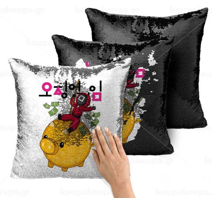 Squid game money pig, Μαξιλάρι καναπέ Μαγικό Μαύρο με πούλιες 40x40cm περιέχεται το γέμισμα