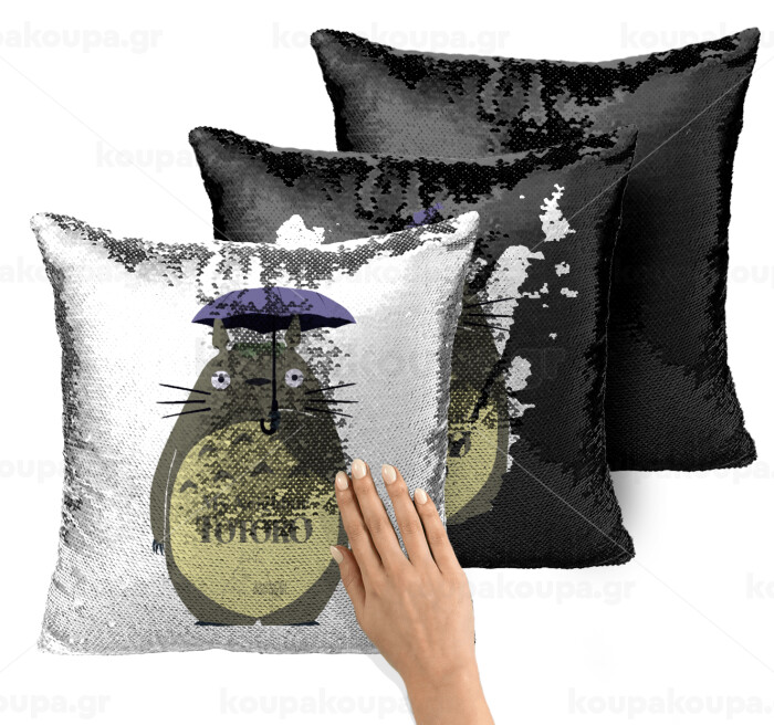 Totoro from My Neighbor Totoro, Μαξιλάρι καναπέ Μαγικό Μαύρο με πούλιες 40x40cm περιέχεται το γέμισμα
