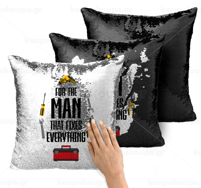 For the man that fixes everything!, Μαξιλάρι καναπέ Μαγικό Μαύρο με πούλιες 40x40cm περιέχεται το γέμισμα