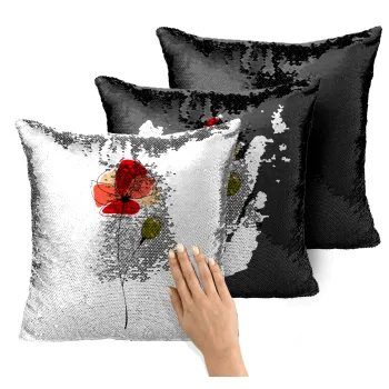 Red poppy flowers papaver, Μαξιλάρι καναπέ Μαγικό Μαύρο με πούλιες 40x40cm περιέχεται το γέμισμα
