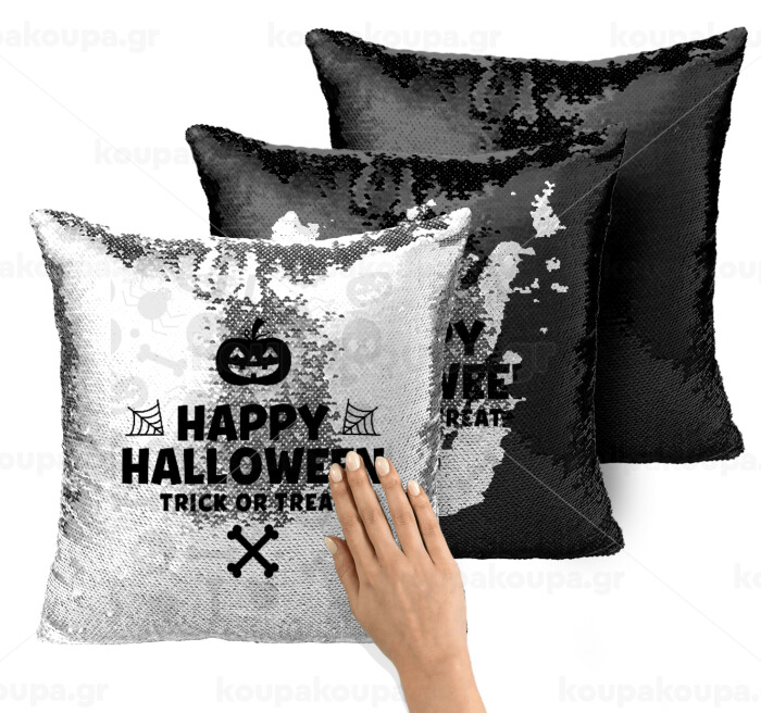 Happy Halloween pumpkin, Μαξιλάρι καναπέ Μαγικό Μαύρο με πούλιες 40x40cm περιέχεται το γέμισμα