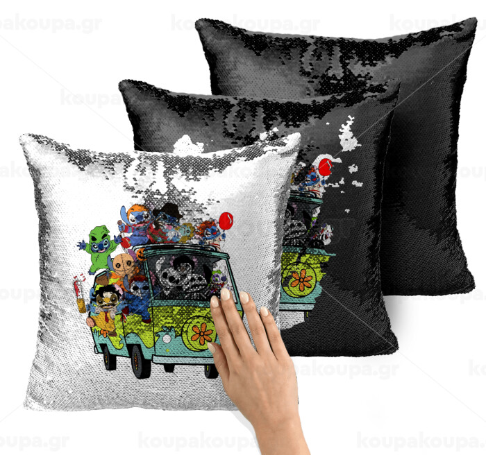 Stitch Halloween scooby car, Μαξιλάρι καναπέ Μαγικό Μαύρο με πούλιες 40x40cm περιέχεται το γέμισμα
