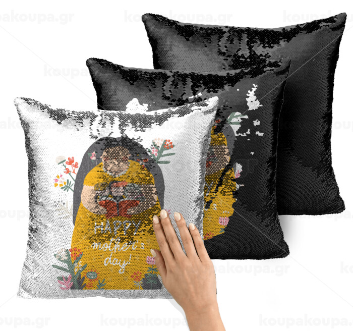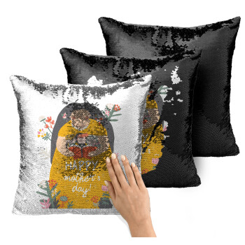 Cute mother reading book, happy mothers day, Μαξιλάρι καναπέ Μαγικό Μαύρο με πούλιες 40x40cm περιέχεται το γέμισμα