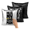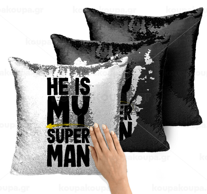 He is my superman, Μαξιλάρι καναπέ Μαγικό Μαύρο με πούλιες 40x40cm περιέχεται το γέμισμα