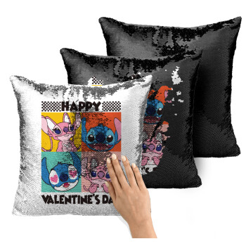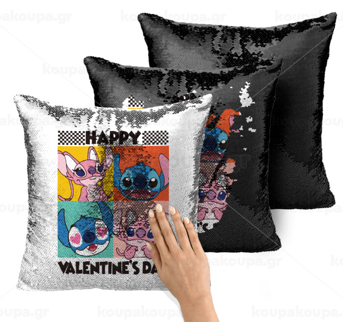 Lilo & Stitch Happy valentines day, Μαξιλάρι καναπέ Μαγικό Μαύρο με πούλιες 40x40cm περιέχεται το γέμισμα