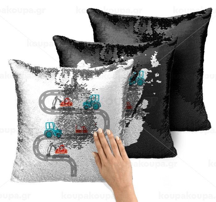 excavator along road, Μαξιλάρι καναπέ Μαγικό Μαύρο με πούλιες 40x40cm περιέχεται το γέμισμα